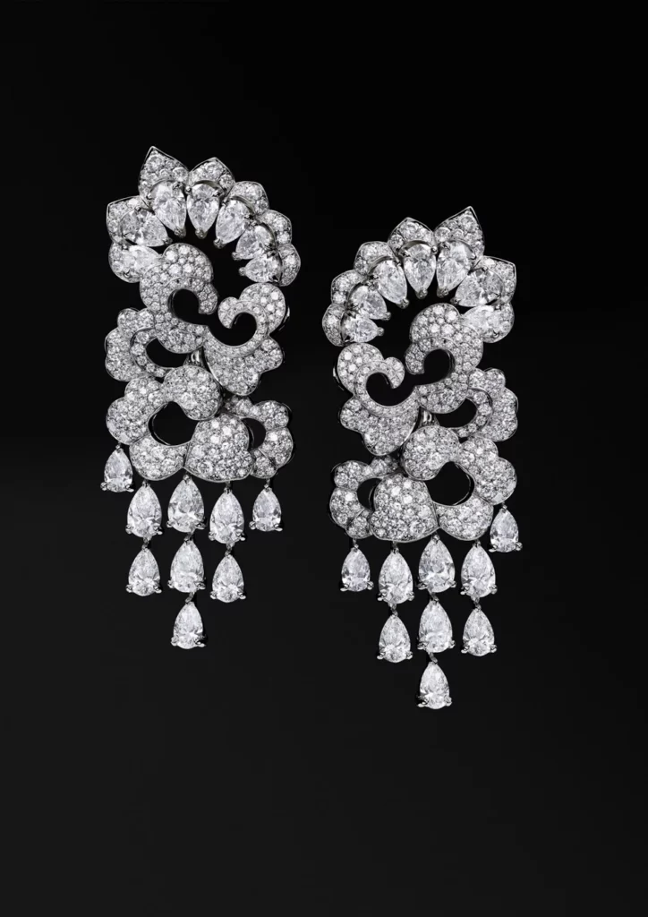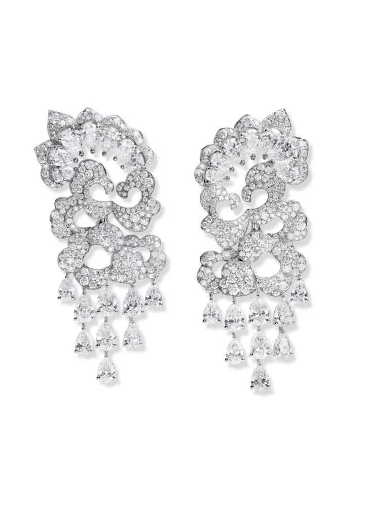 The finale of the collection is a pair of chandelier earrings featuring the Maison’s signature lace-like swirl motifs. Adorned with over 10 carats of pear-shaped and brilliant-cut diamonds, these elegant drops echo the design of the necklace. They capture the romantic moment of light snowflakes falling and condensing into a magnificent, crystalline waterfall upon the ear.