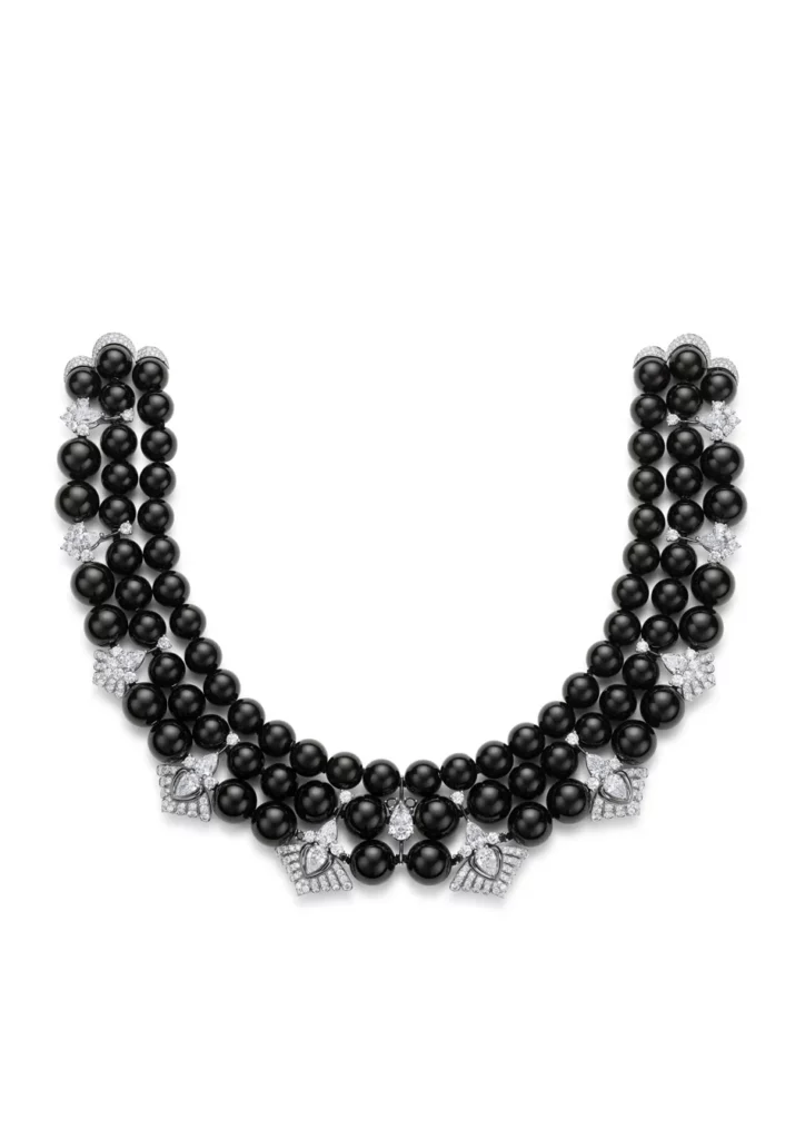 The collection also features a striking three-row beaded necklace that pairs the purity of diamonds with the deep contrast of onyx. Over 650 carats of polished onyx beads are stacked to create a lustrous, understated backdrop reminiscent of the silent midnight sky. Nestled among the beads are pear-shaped and brilliant-cut diamonds, sparkling like snowflakes drifting through the dark. This interplay of light and shadow, depth and brilliance, lends the piece a bold and captivating presence.