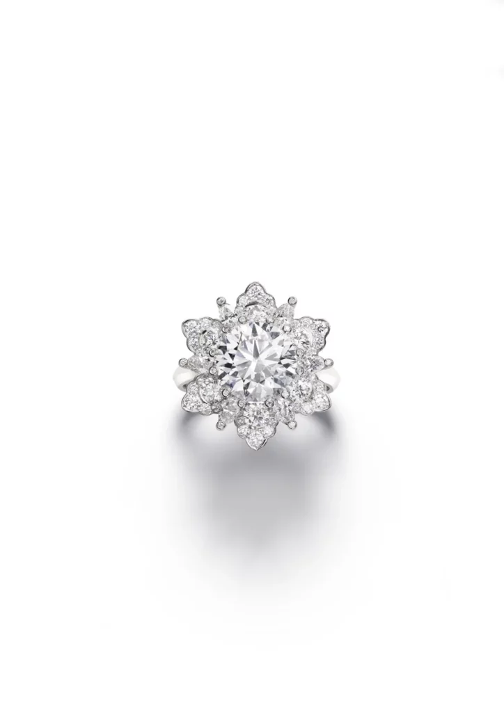 The centerpiece of the new collection is a ring that mimics the delicate geometry of a snowflake. Six petals, meticulously outlined with round diamonds and accented by marquise-cut diamonds, bloom around a magnificent 2.77-carat brilliant-cut center stone. The multi-angled facets create a dazzling interplay of light. This delicate setting captures the unique nature of a snowflake—a one-of-a-kind miracle of nature—reflecting the snow-capped mountains visible from the brand’s Geneva workshops.